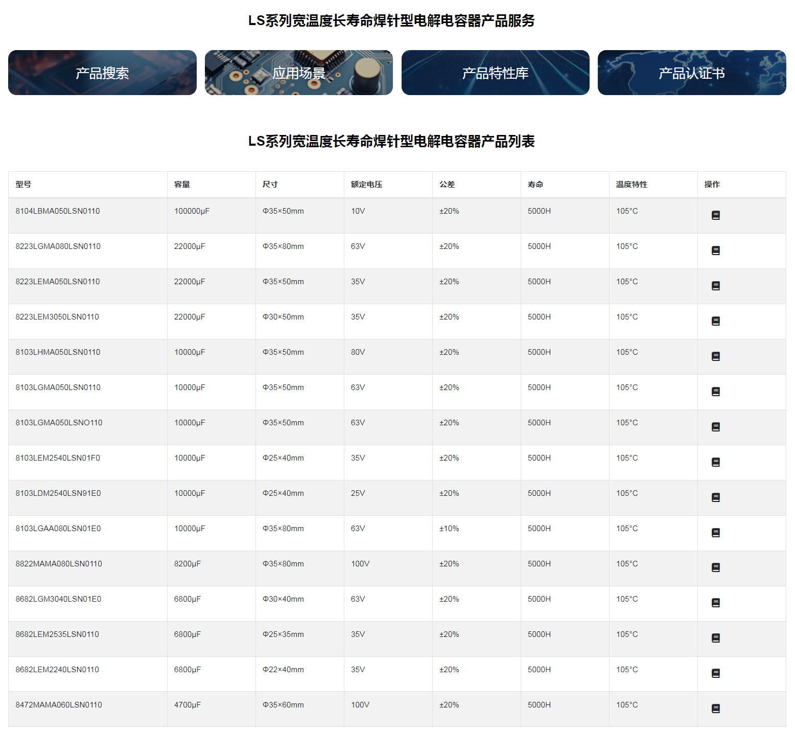 ■LS系列宽温度长寿命焊针型电解电容器◆特征* 寿命: 105℃ 5000 小时* 宽温度范围* 符合 RoHS◆应用:* 适用于开关电源 、通信设备及其它各种电子产品。
